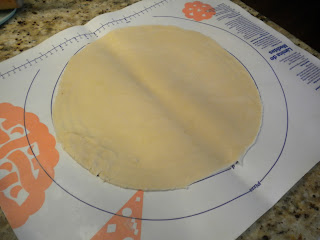 4. Remove 1 of the disks from the bag to a flour coated surface. Using a rolling pin, roll the dough out to a 10-inch round.